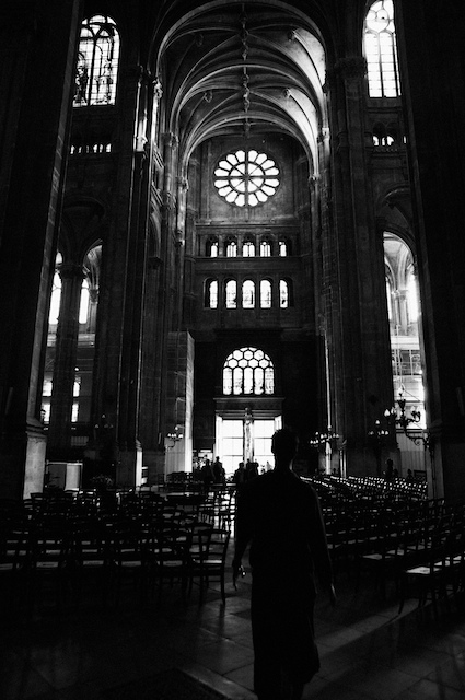 Avec Sacha nous avions envie de prendre quelques photos dans une église, tout près du café Etienne Marcel où nous étions en train de boire un verre, il y a l’église saint Eustache. Sans autorisation Sacha n’a pas hésité à poser dans ce lieu de culte, personne n’est venu nous demander ce que l’on faisait là.